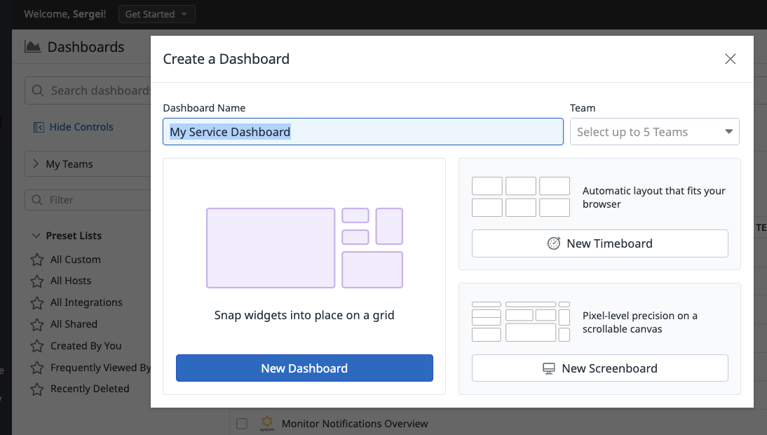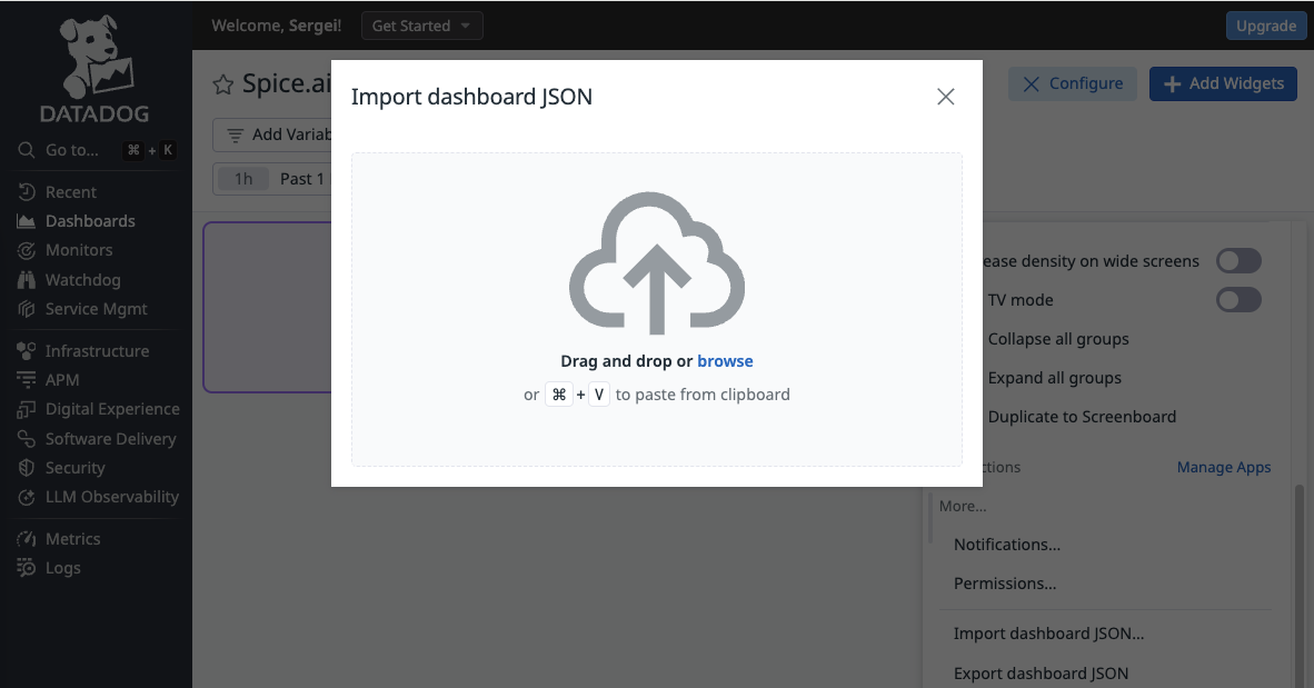 - Click Import dashboard JSON and drag and drop monitoring/datadog-dashboard.json file